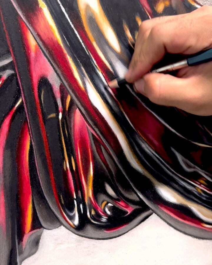 is an emerging artist from Brownsville, Texas known for his photorealistic colored pencil drawings, often featuring iconic pop-culture imagery. His large-scale works transform everyday subjects into striking, detailed compositions. Cristóbal describes his creative process as disciplined yet loose, requiring meticulous attention to detail and patience to achieve vibrant, lifelike results.